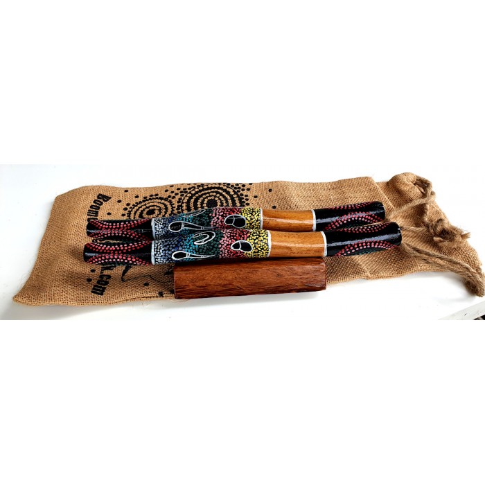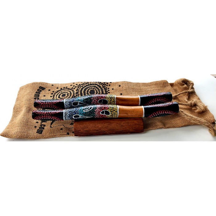 This dot-art clapsticks gift set combines hand-painted wooden clapsticks, a decorative display stand, and a natural jute gift bag for an authentic presentation that celebrates Aboriginal-inspired art and craftsmanship. Perfect as a personalised corporate gift, school award, or cultural keepsake.